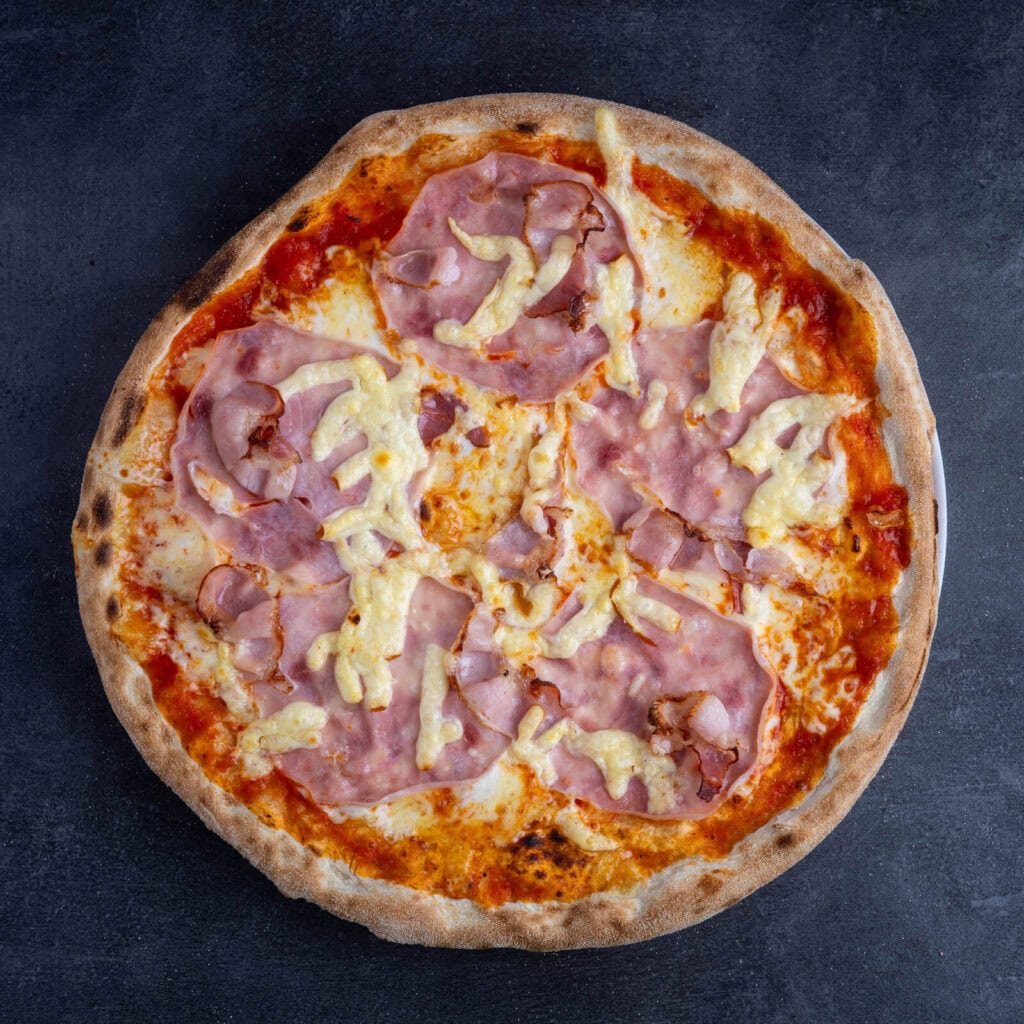 pikantný základ, syr Mozzarella, šunka, slanina, údený syr