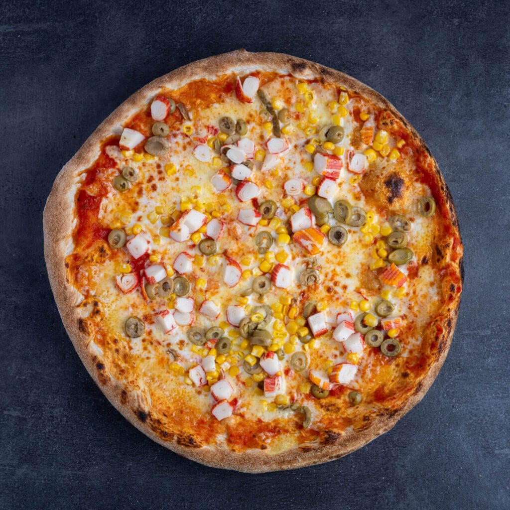 paradajkový základ, mozzarella, kukurica, olivy, krabie tyčinky