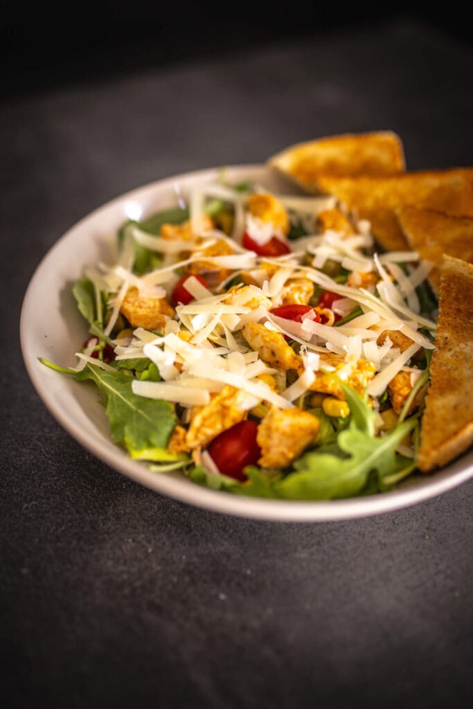ľadový šalát, rukola, cherry rajčina, kukurica, olivy, kuracie mäso, syr Parmezán, dressing