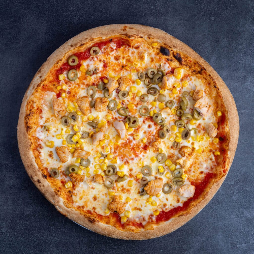 paradajkový základ, syr Mozzarella, kukurica, olivy, kuracie mäso