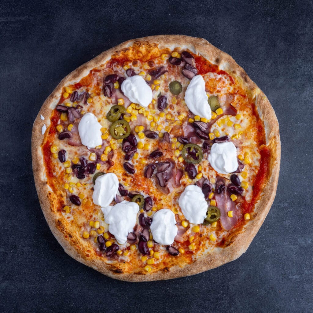 paradajkový základ, syr Mozzarella, fazuľa, kukurica, slanina, čili, kyslá smotana