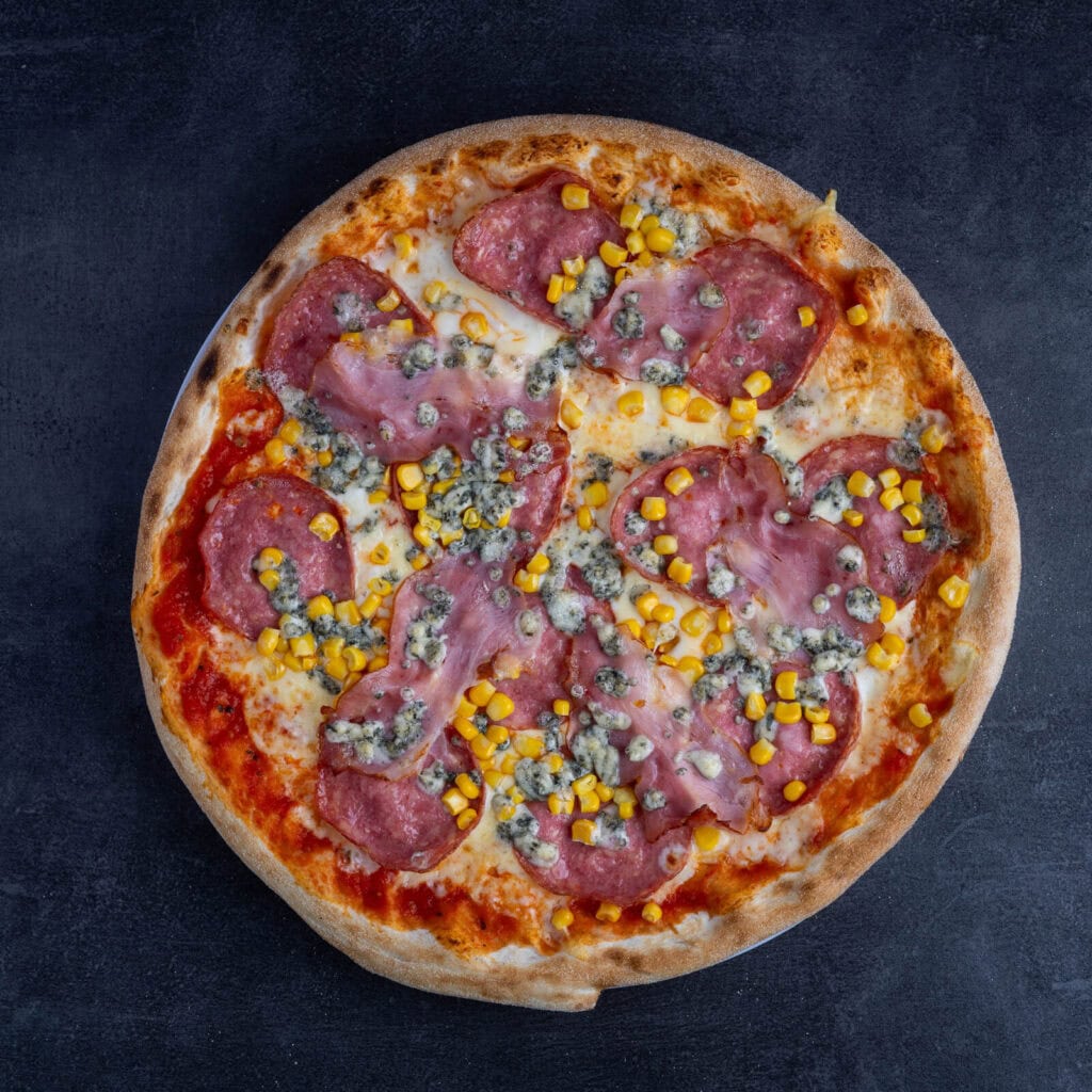 paradajkový základ, syr Mozzarela, saláma, slanina, kukurica, syr Niva, oregano