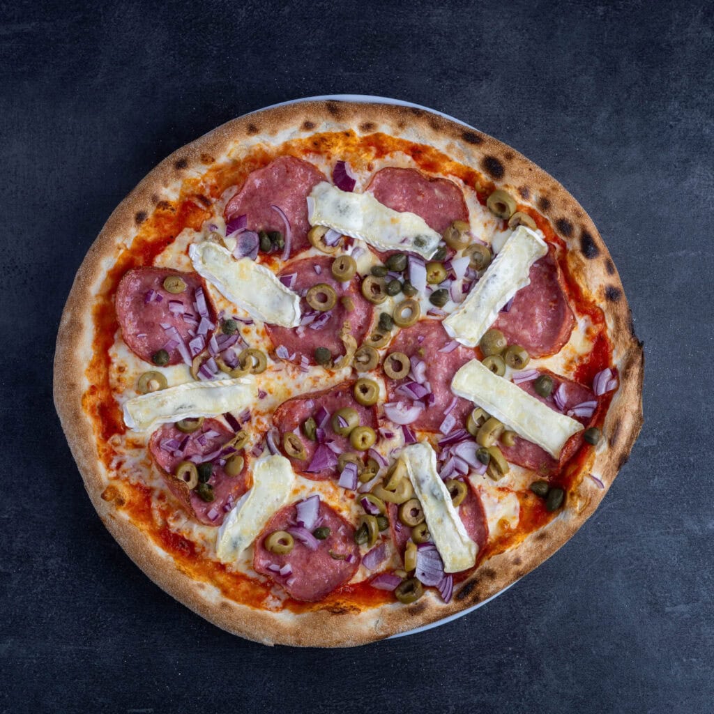 paradajkový základ, syr Mozzarella, saláma, syr Encián, cibuľa, olivy, kapary