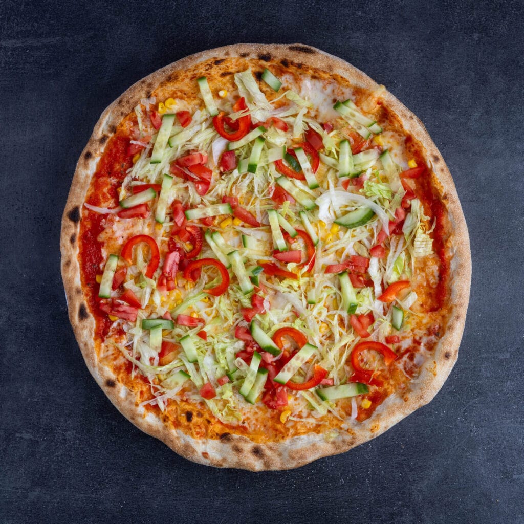 paradajkový základ, syr Mozzarella, kukurica, čerstvá zelenina