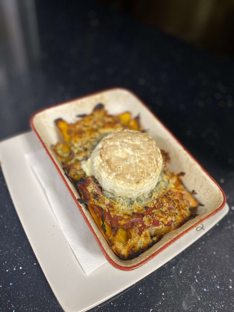 zemiaky, šampiňóny, slanina, syr Encián, syr Niva, cesnak